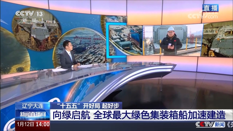 1月12日,大连中远海运川崎亮相央视新闻“迈向‘十五五’的美丽图景・一线见闻”直播连线节目。节目从“攻坚突破 全球最大绿色集装箱船火热建造”“先进技术赋能 国产巨轮领先全球”“全球航运绿色化 中国造赢得更多青睐”三个切入点,对大连中远海运川崎首制24kTEU甲醇双燃料集装箱船及其建造情况进行了专题报道,充分展现了公司在高端绿色船舶建造领域的技术优势。 作为中远海运重工主力船厂之一,大连中远海运川崎“十五五”期间将继续锚定“绿色低碳、数字智能”双赛道,全力推动新能源船舶研发、智能工厂升级与绿色转型,为中远海运重工高质量发展注入强劲动能,为中国船舶工业走向绿色化、智能化贡献更大力量。